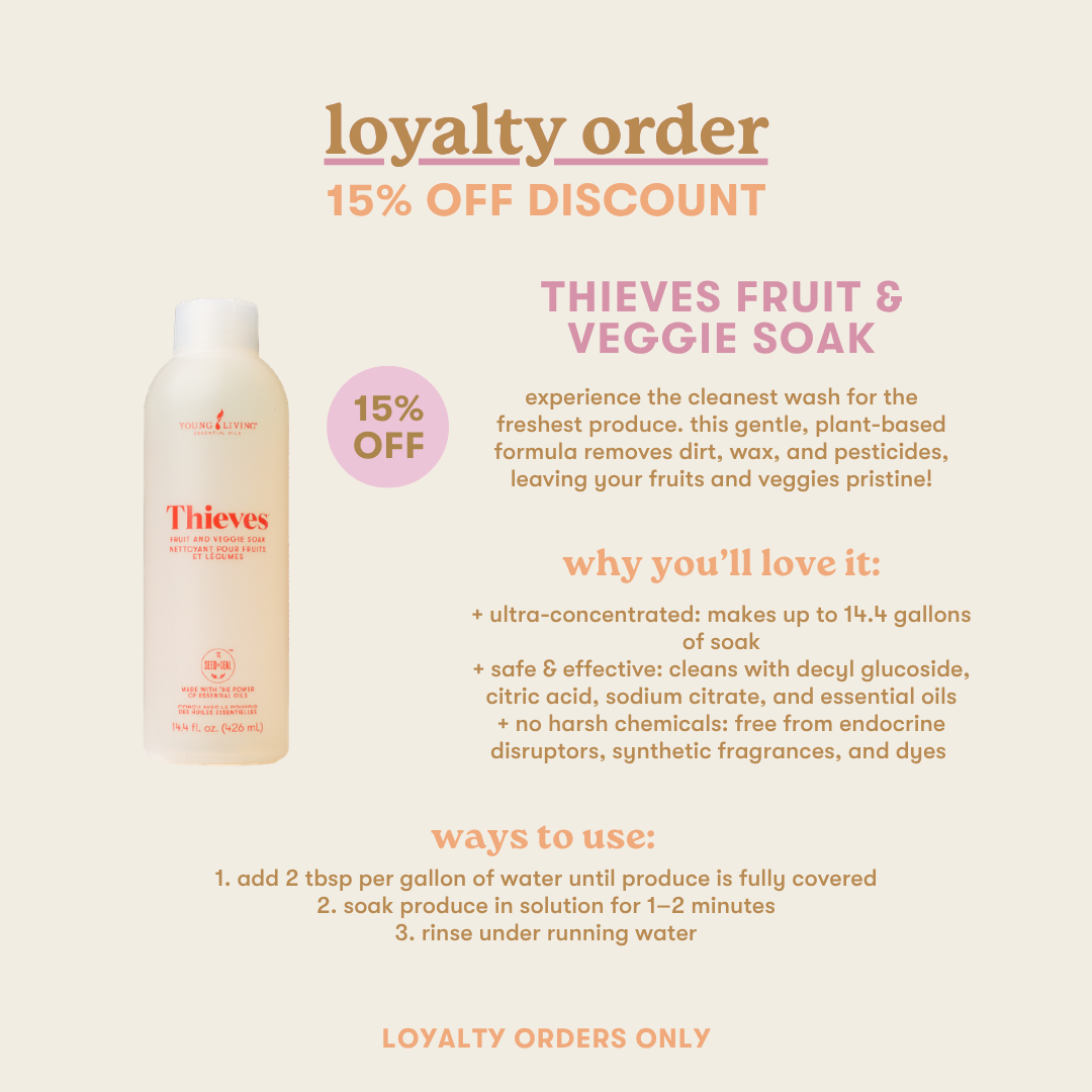 Get 15% off THIEVES FRUIT & VEGGIE SOAK when you add it to your Loyalty Order!