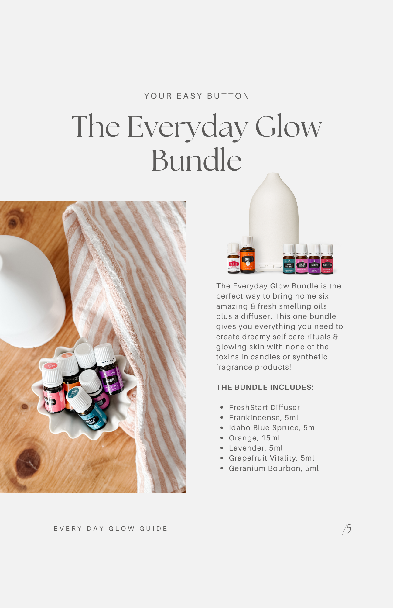 The Everyday Glow Bundle is the perfect way to bring home six amazing & fresh smelling oils plus a diffuser. This one bundle gives you everything you need to create dreamy self care rituals & glowing skin with none of the toxins in candles or synthetic fragrance products!